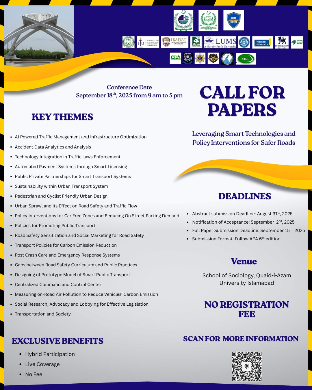 The Road Safety in Pakistan Conference aims to bring together researchers, practitioners, policymakers, and industry experts to explore the current state of road safety in Pakistan and to discuss innovative approaches for improving it. The conference will focus on the integration of smart technologies, data-driven strategies, and effective policy interventions to address the challenges of road safety in Pakistan. Participants will have the opportunity to present their research, share insights, and collaborate on developing actionable solutions to enhance road safety.